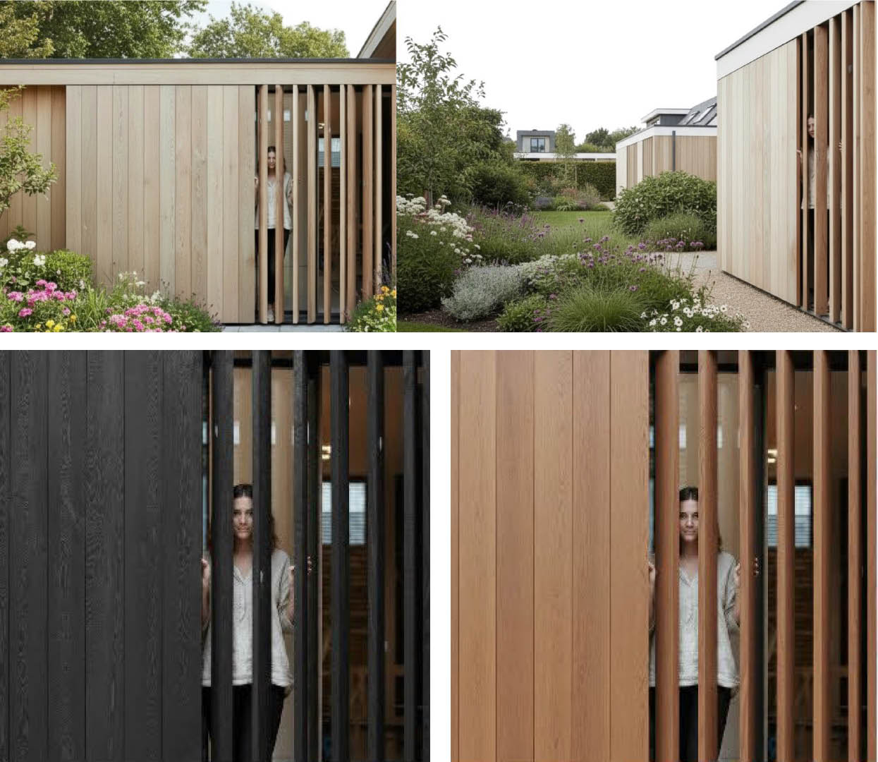 Suoraviivaiseen ilmeeseen tuo miellyttävää rentoutta se, että säleikkö voi olla huolettomasti osin auki ja osin kiinni ilman, että kokonaisuus näyttää sekavalta. Ratkaisun monipuolisuutta lisäävät mitoituksien ja puulajien vaihtelu. Lumon voi kuvitella toimivan monenlaisissa ympäristöissä ja eri arkkitehtuurin tyylien kanssa. Perinteinen suora lauta pääsee loistamaan tässä briljantin yksinkertaisessa ideassa.