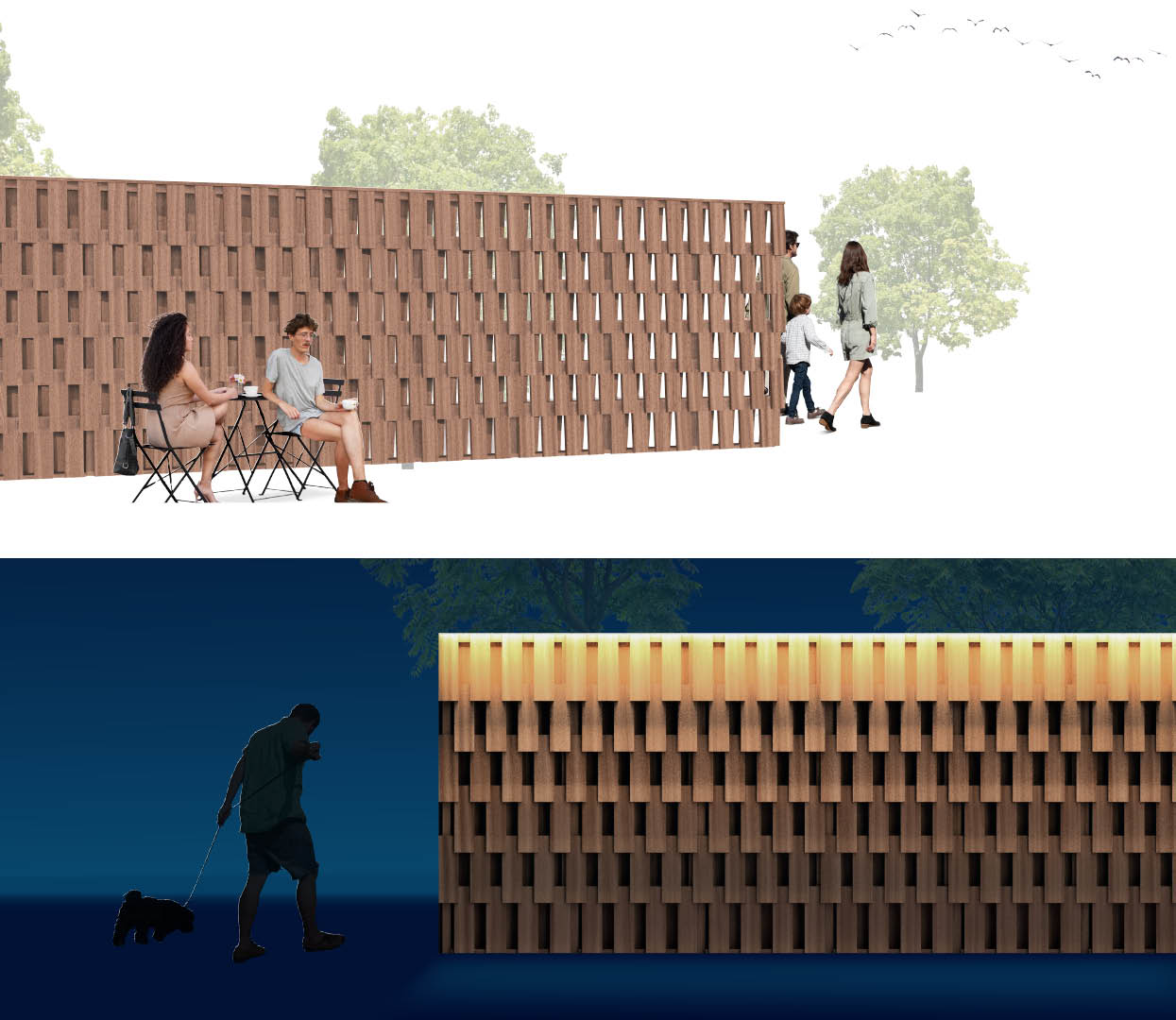 Paanupintoja on käytetty arkkitehtuurin sisätiloissa sekä rakennusten katoissa ja julkisivuissa melko paljon, mutta aitojen pintana paanuja ei ole vielä kilpailutyön tapaan nähty. Paanupinnan kolmiulotteisuus on tuotu työssä hienosti esiin valaistuksen esittävällä visualisoinnilla ja oman efektinsä aidan ulkoasuun voi kuvitella tuovan luonnollisesti harmaantuva puu. Ajankohtaista lisäarvoa ideaan tuo mahdollisuus hyödyntää myös tuotannon hukkamateriaalia. Työ on viety hienosti valmiiksi konseptiksi, jossa esitellään myös modulaarisuus ja variaatiot eri muotoisilla paanuilla.